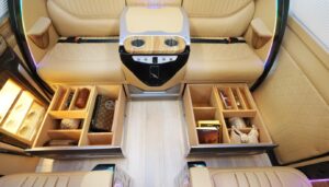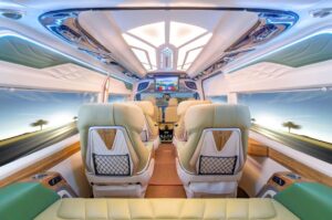 Ngoài ra, xe trang bị tivi LED Sony 32 inch, Apple TV, iPad Air, tủ lạnh 22 lít, hệ thống đèn giọt nước President, hệ thống đèn trần sao 6 màu, âm thanh Sony 2-Way, rèm cửa tự động nhập khẩu Mỹ, kết nối 4G, cổng sạc USB, ổ cắm điện, đèn đọc sách…