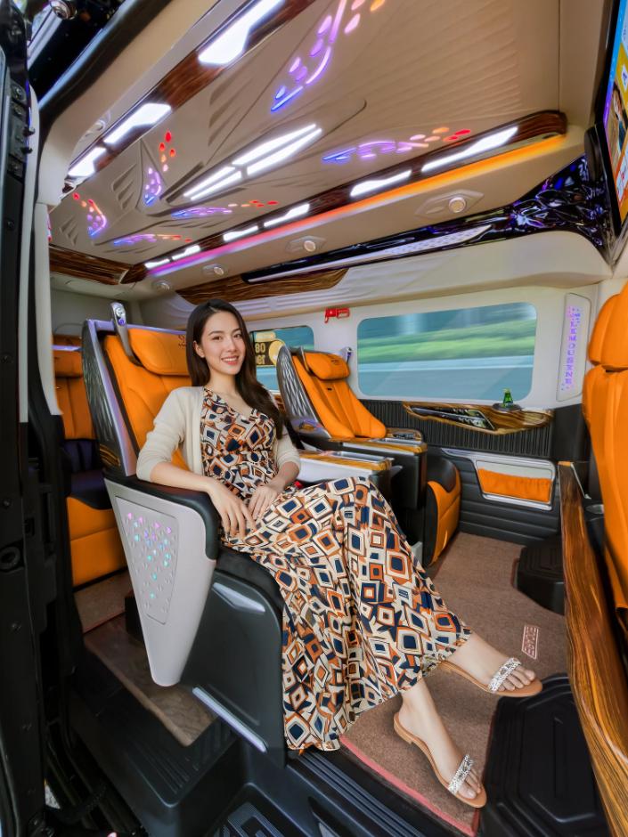 Xe của Mỹ Lệ được thiết kế theo phong cách ghế thương gia như trên máy bay, mang lại trải nghiệm thoải mái trong suốt hành trình.